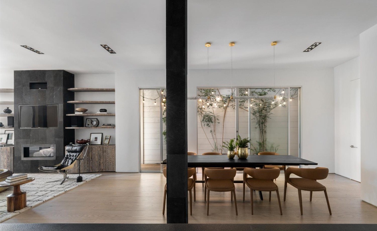 A stunning open-concept dining and living space defined by a dramatic black concrete central pillar, warm hardwood flooring, and seamless integration of natural light through expansive floor-to-ceiling windows overlooking a planted courtyard. The sophisticated palette of whites, blacks, warm woods, and brass accents creates a balanced, magazine-worthy retreat that blends organic warmth with refined modern minimalism.