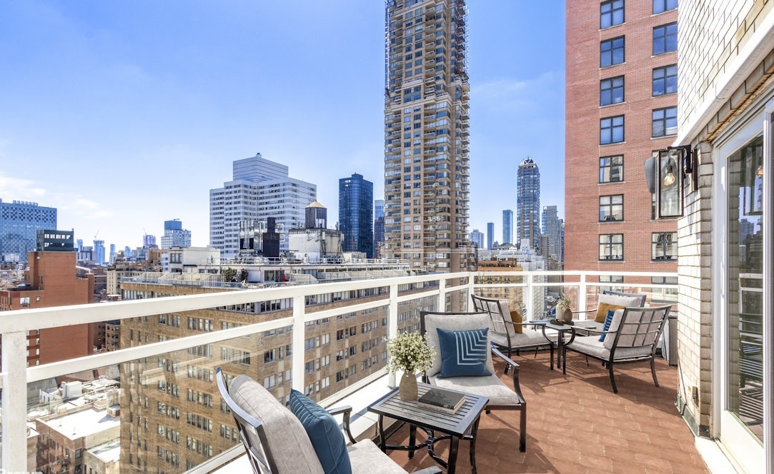 A stunning high-rise penthouse terrace overlooking a dynamic Manhattan skyline, featuring elegant outdoor seating in neutral tones with navy accents, pristine white railings, and abundant natural light. The space exemplifies sophisticated urban luxury with sweeping city views and expertly curated furniture that balances comfort with refined design.