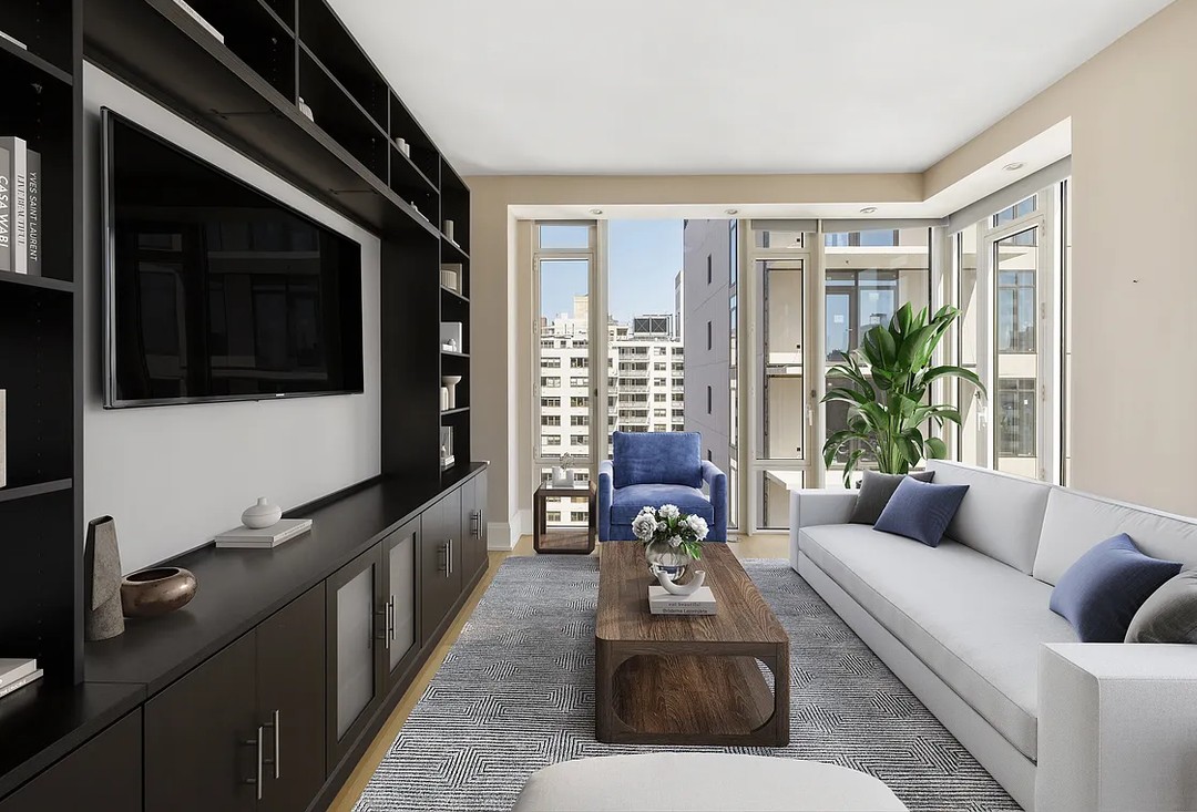 A sophisticated, light-filled living room showcasing transitional design with a striking black built-in media wall anchoring a minimalist seating arrangement. The space masterfully balances dark architectural elements with bright, airy windows framing an urban skyline, creating an elegant sanctuary with carefully curated modern furnishings and natural materials.