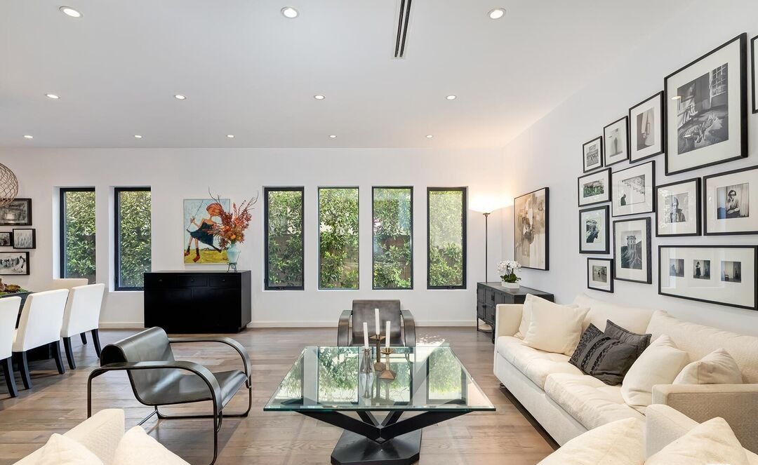 A stunning open-concept living room featuring floor-to-ceiling black-framed windows overlooking lush greenery, warm hardwood flooring, and sophisticated transitional design blending traditional crown molding with modern furnishings. The space is elevated by a curated gallery wall, statement lighting, and a sculptural glass coffee table that anchors the seating arrangement of cream-toned upholstered pieces.