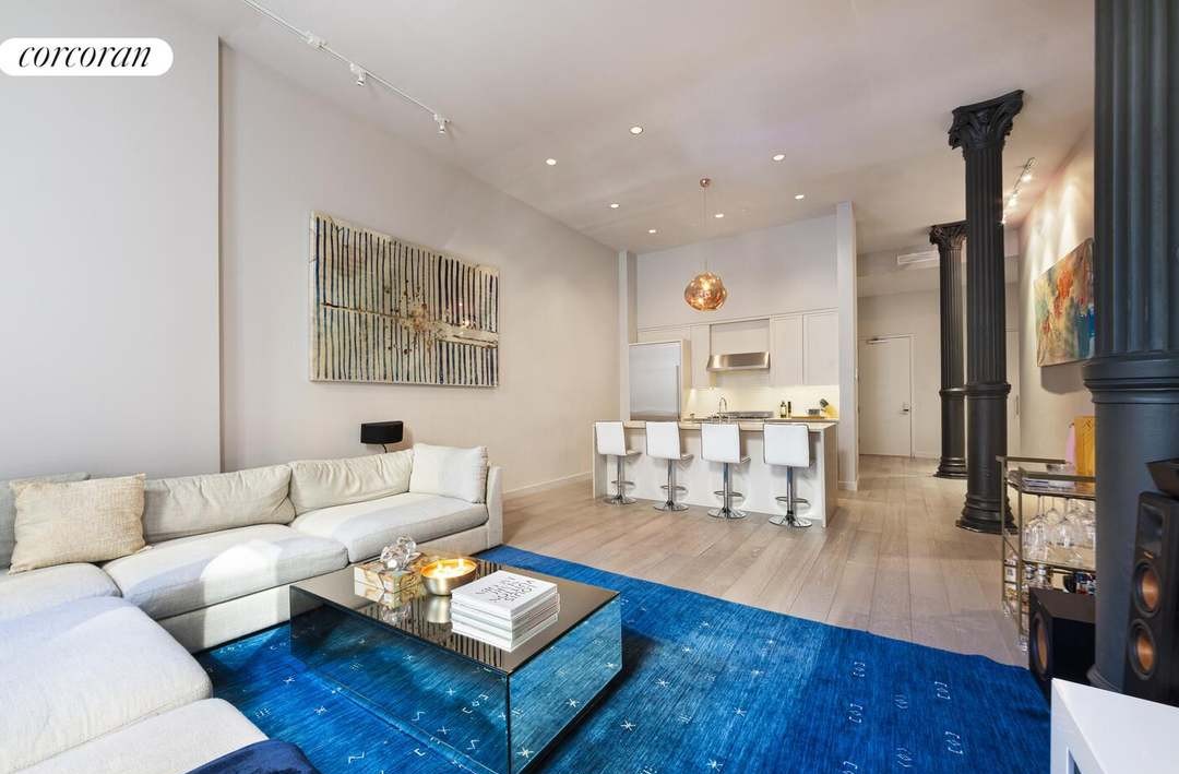 A sophisticated open-concept living and kitchen space featuring a refined palette of cream, white, and navy accents elevated by striking architectural details including black neoclassical columns, a sculptural brass pendant, and a vibrant cobalt-blue geometric rug that anchors the elegant seating area. The design seamlessly blends transitional elegance with organic modern warmth through natural hardwood flooring, clean-lined furnishings, and curated contemporary artwork.