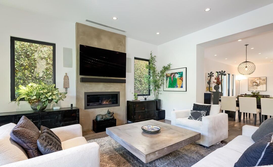 A sophisticated open-concept living room featuring a striking two-sided fireplace with concrete surround and black-framed TV, anchored by a low concrete coffee table and wrapped in soft cream and gray seating. The space balances warm natural wood floors with cool whites and blacks, enhanced by abundant natural light from framed landscape windows, lush living plant installations, and a statement geometric pendant fixture that elevates the carefully curated modern aesthetic.