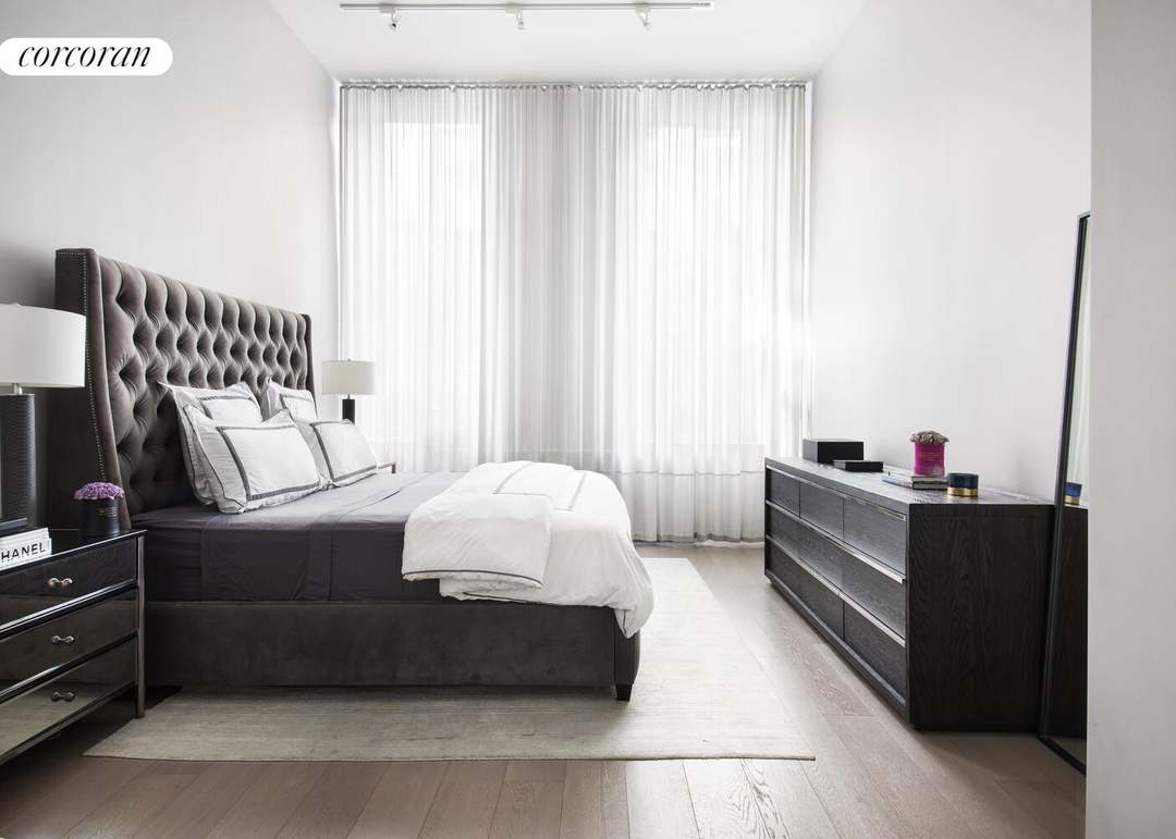 A sophisticated primary bedroom featuring a striking black tufted headboard with nailhead detailing, crisp white bedding, and dark wood furnishings anchored by light natural hardwood flooring. The space achieves dramatic elegance through a cool monochromatic palette punctuated by subtle purple accents, abundant natural light from floor-to-ceiling windows dressed in vertical sheers, and contemporary chrome track lighting.