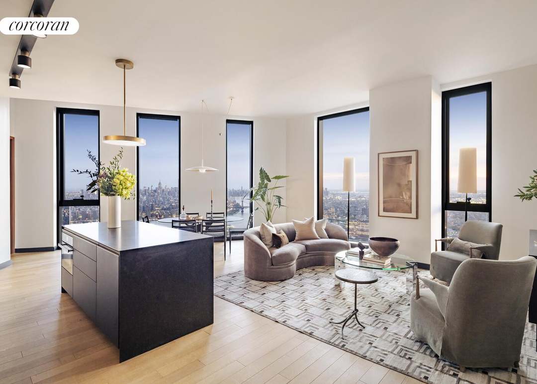 A stunning high-rise living room bathed in natural light from floor-to-ceiling windows framing an iconic cityscape, featuring a sophisticated palette of warm neutrals, sculptural brass-accented pendant lighting, and carefully curated organic modern furnishings that balance elegance with understated warmth.