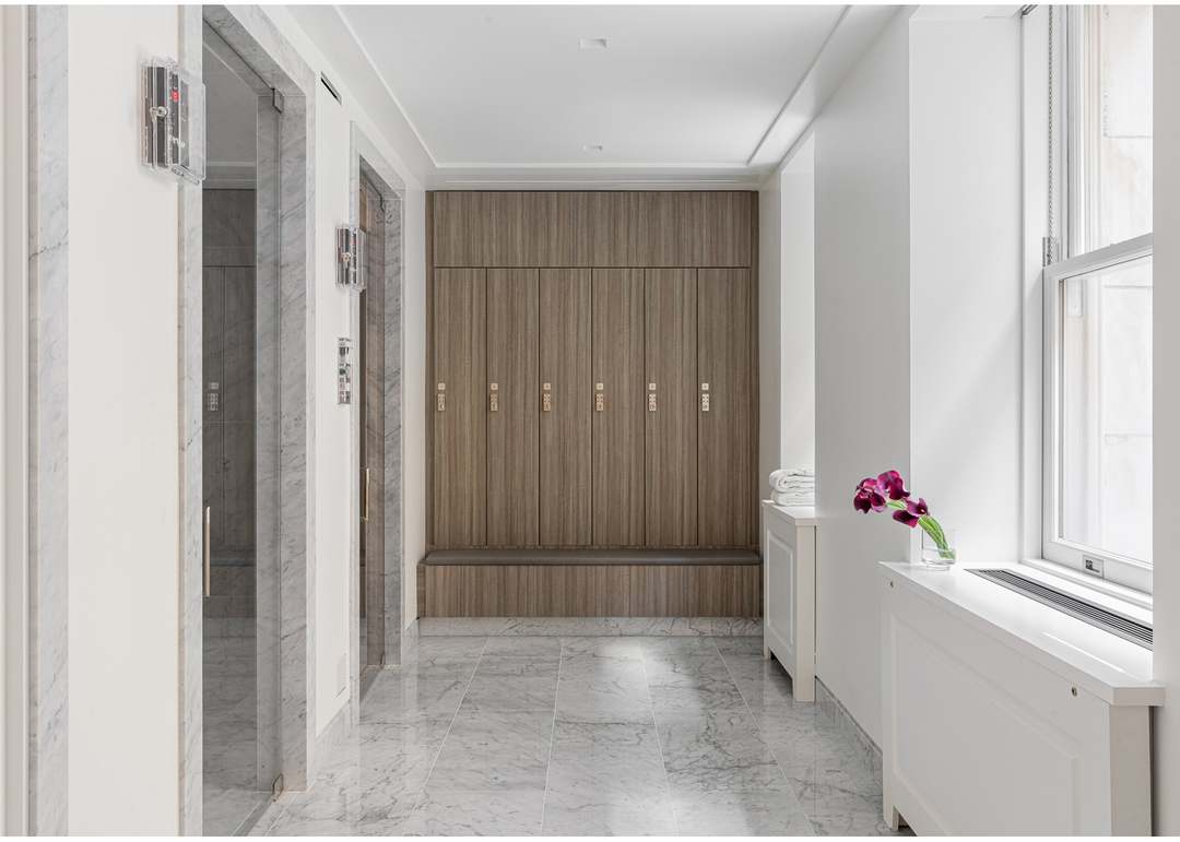 This spa-like primary bathroom features a sophisticated palette of white, gray, and warm taupe tones with large-format marble flooring and a floating vanity beneath abundant natural light. The frameless glass walk-in shower with chrome fixtures and extensive custom cabinetry create a seamlessly luxurious and serene retreat with refined transitional details.