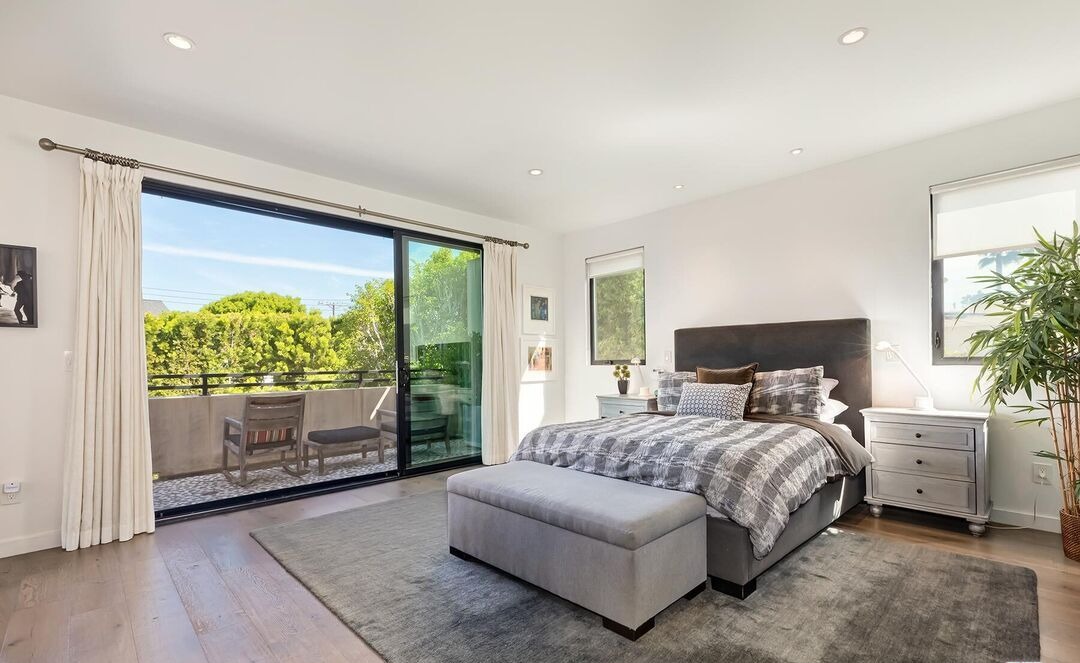 A serene primary bedroom suite with abundant natural light from floor-to-ceiling glass doors opening to a private balcony overlooking lush greenery. The space features a sophisticated neutral palette of whites and grays with warm wood flooring, complemented by a gray upholstered bed, soft furnishings, and understated brass accents that create an inviting yet refined sanctuary.