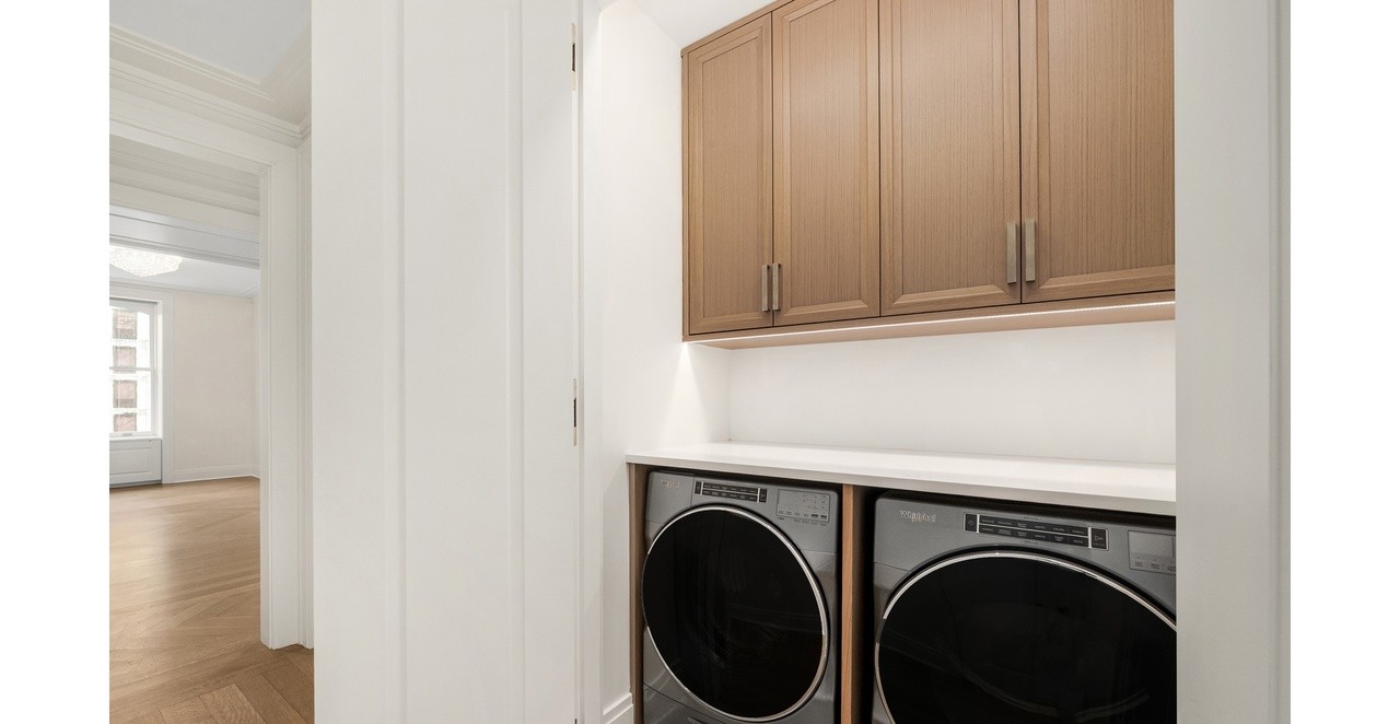 A meticulously designed luxury laundry room featuring light wood cabinetry above white quartz countertops with modern chrome hardware and seamlessly integrated high-end washer and dryer units. The space balances functionality with refined aesthetics through abundant natural light, professional-grade appliances, and elegant millwork details including crown molding and built-in shelving.