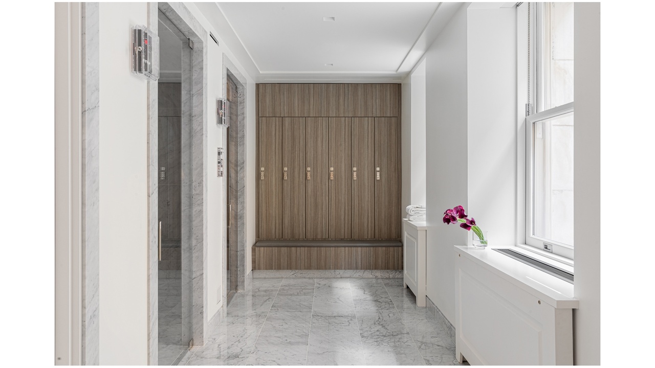 A sophisticated primary bathroom featuring dual walk-in showers with frameless glass enclosures and warm wood-paneled cabinetry that contrasts beautifully against gray marble tile and white painted walls. The space exemplifies serene luxury with abundant natural light, minimalist hardware, and a spa-like aesthetic enhanced by architectural millwork and premium materials.