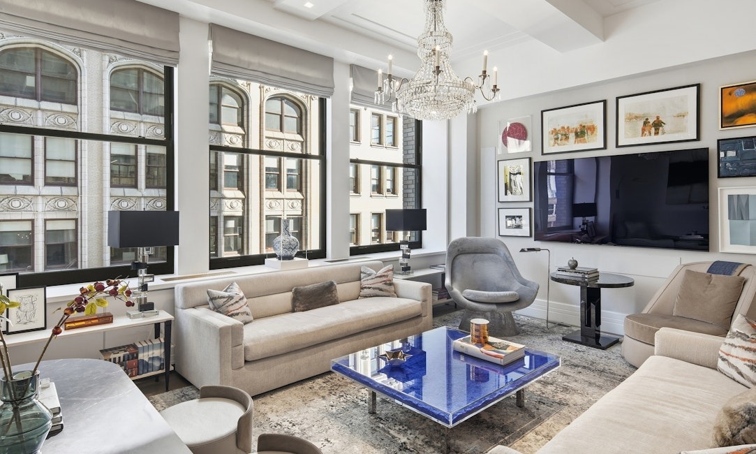 A sophisticated urban penthouse living room that seamlessly blends transitional elegance with contemporary glam, featuring soaring windows overlooking an iconic cityscape, statement crystal chandelier, custom built-in shelving, and a striking cobalt-blue glass coffee table as a focal point. The neutral cream and gray furnishings are balanced by bold jewel-tone accents and curated artwork, creating a refined yet visually dynamic space that epitomizes luxury Manhattan design.