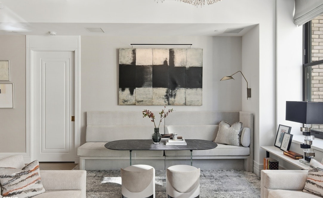 A serene, sophisticated living room featuring a contemporary built-in banquette with neutral linen upholstery, anchored by a striking black-and-cream abstract artwork and minimalist concrete coffee table with sculptural ceramic stools. The space exemplifies transitional luxury with crisp millwork, abundant natural light from tall windows, and a carefully curated material palette that balances warmth with refined restraint.