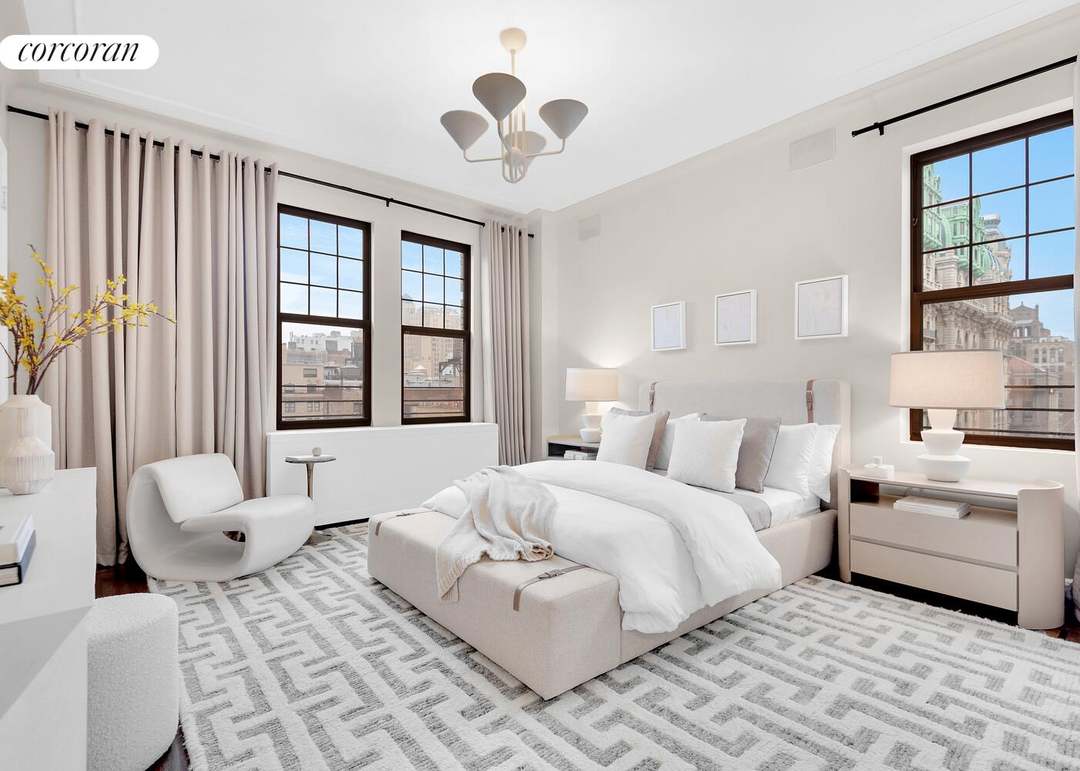 A serene, light-filled primary bedroom suite featuring expansive city views through tall windows with elegant floor-to-ceiling drapery, white and cream furnishings, and warm brass accents throughout. The space balances traditional architectural details like crown molding with contemporary furnishings and a sophisticated geometric patterned carpet, creating a refined transitional aesthetic.