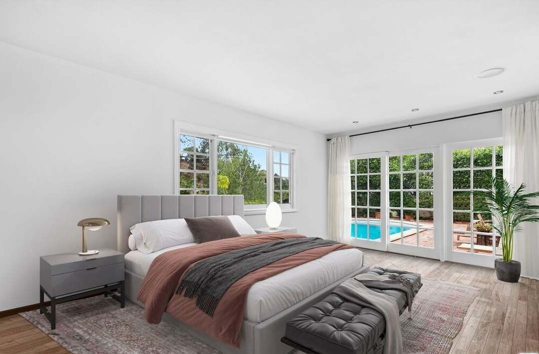 A serene primary bedroom suite featuring expansive floor-to-ceiling windows and glass patio doors overlooking a pool, flooded with natural light and creating seamless indoor-outdoor connection. The space balances warm organic materials—hardwood flooring, potted greenery—with contemporary minimalism through a neutral palette of whites, grays, and warm wood tones, accented with rust and charcoal textiles.