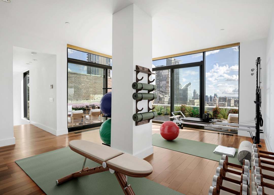 A sophisticated penthouse home gym with soaring white ceilings, expansive floor-to-ceiling windows showcasing a dramatic city skyline, and a warm wood floor that contrasts beautifully with the minimalist aesthetic. The space seamlessly integrates fitness equipment, a yoga/pilates area with green mats, and an adjacent terrace with lounge seating, embodying luxury wellness design with abundant natural light and premium materials.