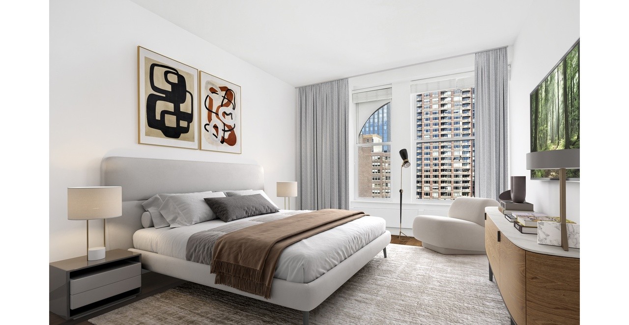 A sophisticated primary bedroom showcasing organic modern design with abundant natural light from expansive city-view windows and a private balcony. The serene palette of whites, grays, and natural wood tones is anchored by a sculptural upholstered bed and complemented by curated abstract artwork and contemporary furnishings, creating a luxurious yet understated urban retreat.