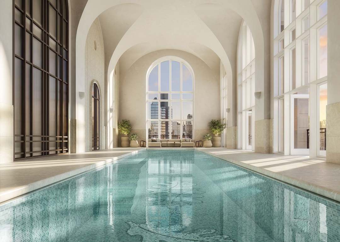 An exceptionally refined indoor swimming pool featuring a soaring barrel-vaulted ceiling with soft cream plaster, monumental arched windows overlooking a city skyline, and serene turquoise-tiled pool water reflecting clean architectural lines. The space exemplifies contemporary luxury through restrained color palette, dramatic proportions, and seamless integration of classical architectural elements with modern minimalist aesthetics.
