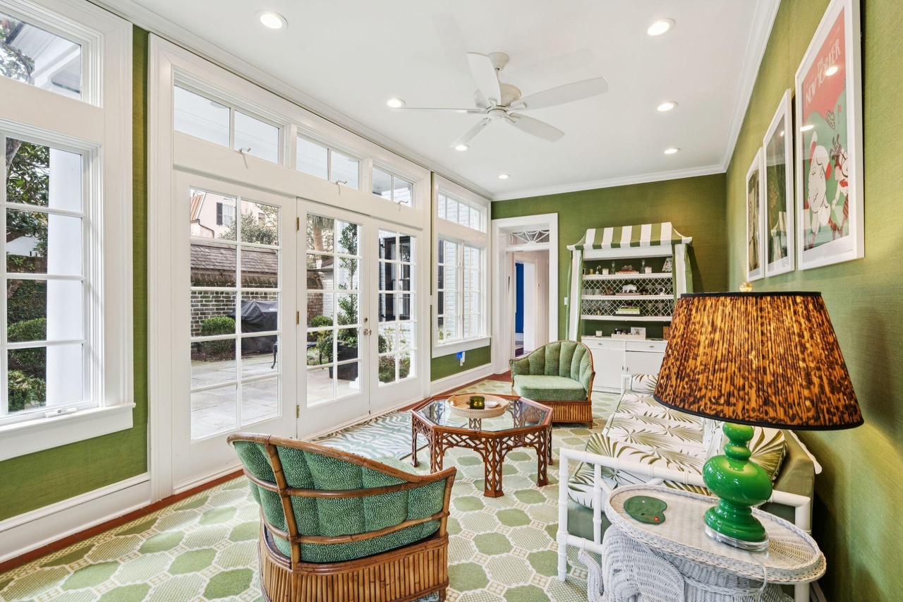 A sophisticated sunroom and outdoor living space featuring a vibrant sage-green wall treatment paired with crisp white millwork, abundant natural light from floor-to-ceiling French doors, and carefully curated mid-century furnishings in rattan and green upholstery. The space seamlessly blends classic New England elegance with updated contemporary comfort, creating an inviting retreat that bridges indoor and outdoor living.