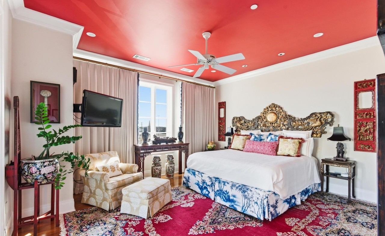 A stunning primary bedroom featuring a bold red tray ceiling that commands attention, paired with cream walls and ornate gilt-carved architectural detailing. The space masterfully blends new traditional elegance with glam sensibilities through a rich palette of navy blue porcelain accents, pink textiles, and brass hardware, creating a highly curated and magazine-worthy sanctuary with abundant natural light from oversized windows.