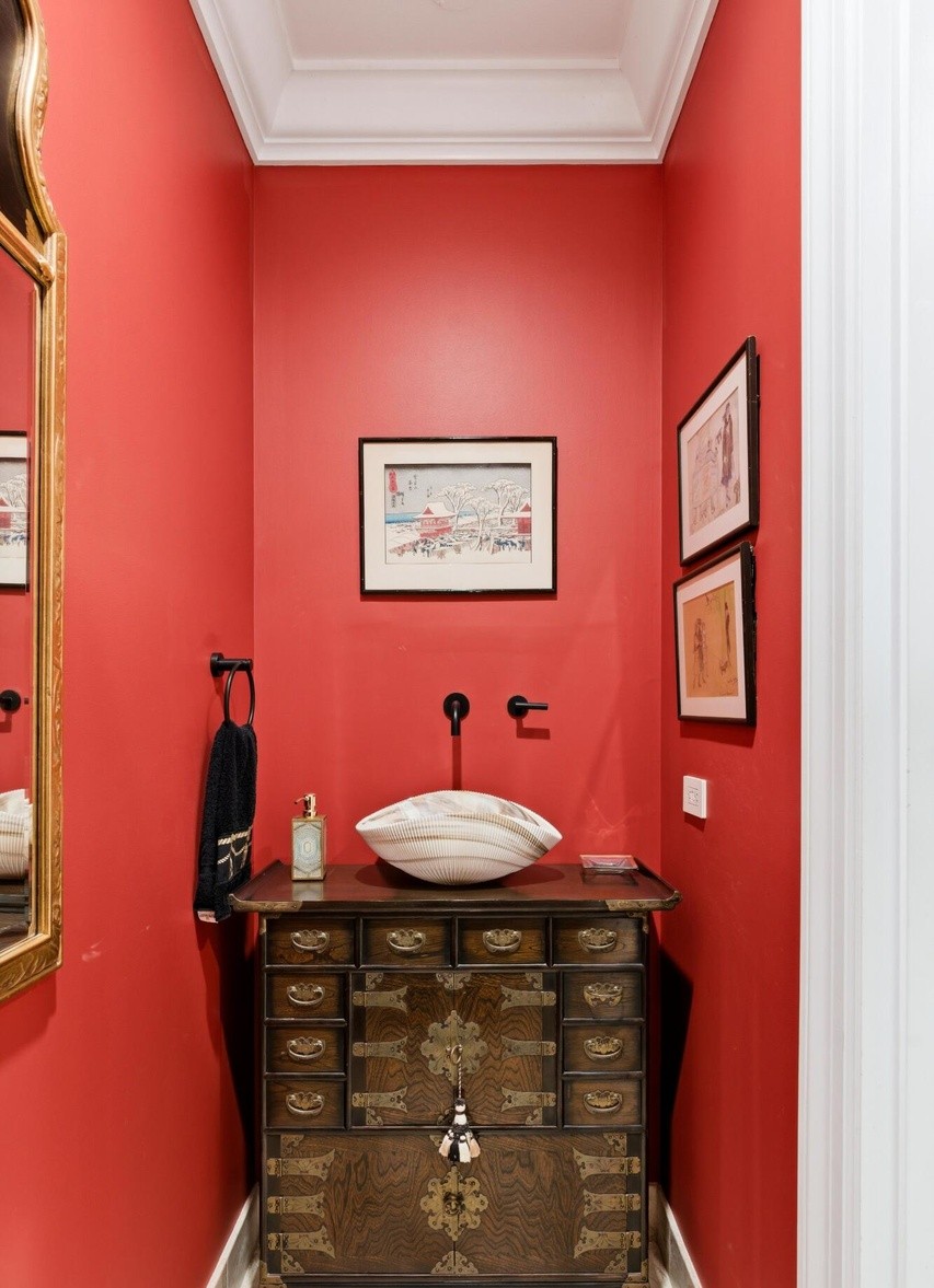 A striking powder room with bold coral-red walls and an ornate coffered ceiling creates a dramatic, gallery-like backdrop for a collection of framed Asian artwork and a richly decorated dark wood antique chest. The space exemplifies transitional-glam design with its sophisticated color choice, brass hardware, and carefully curated decorative elements that balance traditional architectural details with contemporary boldness.