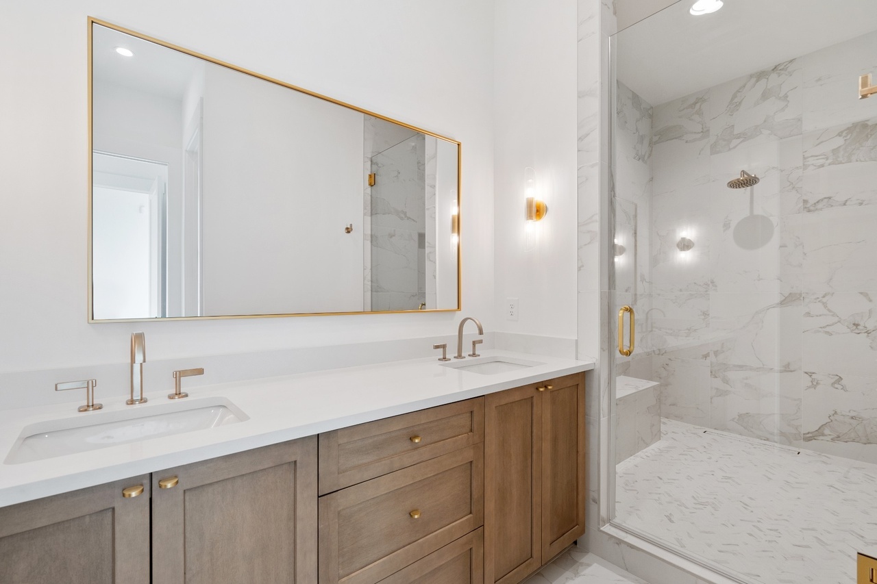 A sophisticated primary bathroom featuring a luxurious double vanity with light wood cabinetry and marble countertops, paired with a spacious walk-in shower clad in large-format marble tile and frameless glass enclosure. Warm brass hardware and strategically placed sconce lighting create an airy, spa-like atmosphere punctuated by elegant contemporary details.
