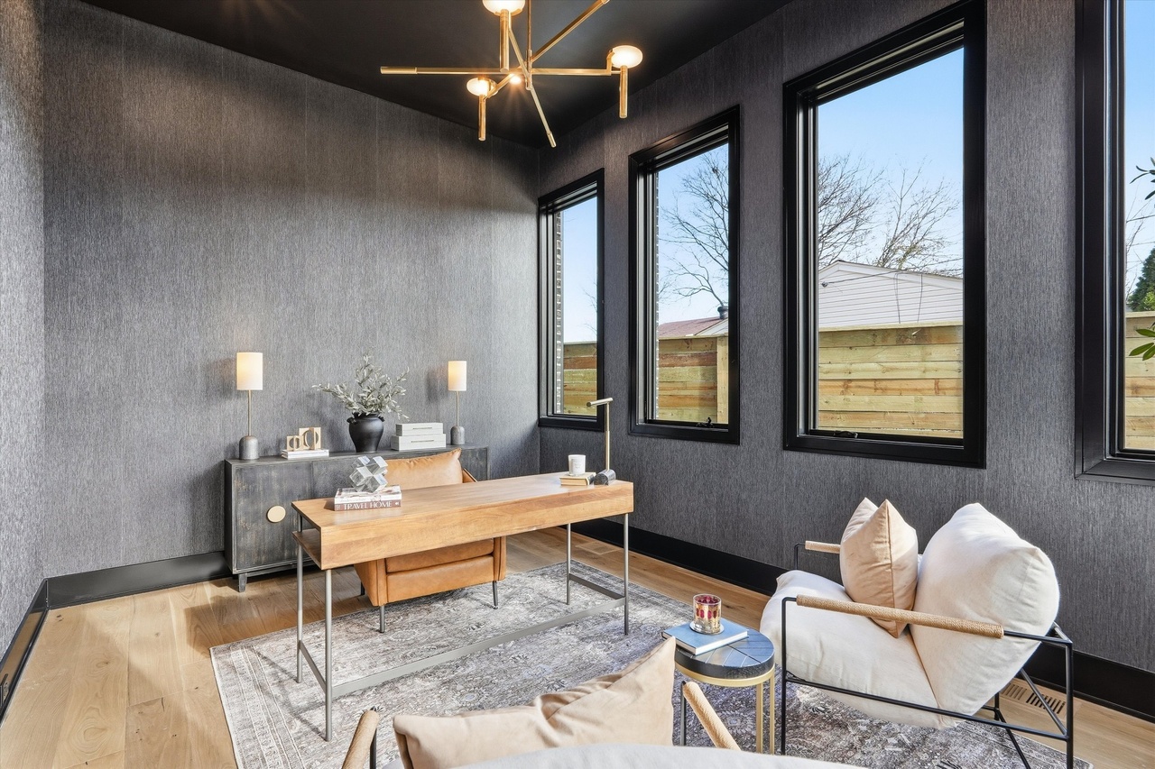 A sophisticated home office featuring warm-toned natural wood furnishings and charcoal gray textured walls, anchored by abundant natural light from three large black-framed windows overlooking a wooden fence. The space balances modern minimalism with organic warmth through a mid-century inspired desk, thoughtfully layered furnishings, and a striking brass statement chandelier, creating an elegant yet functional workspace.