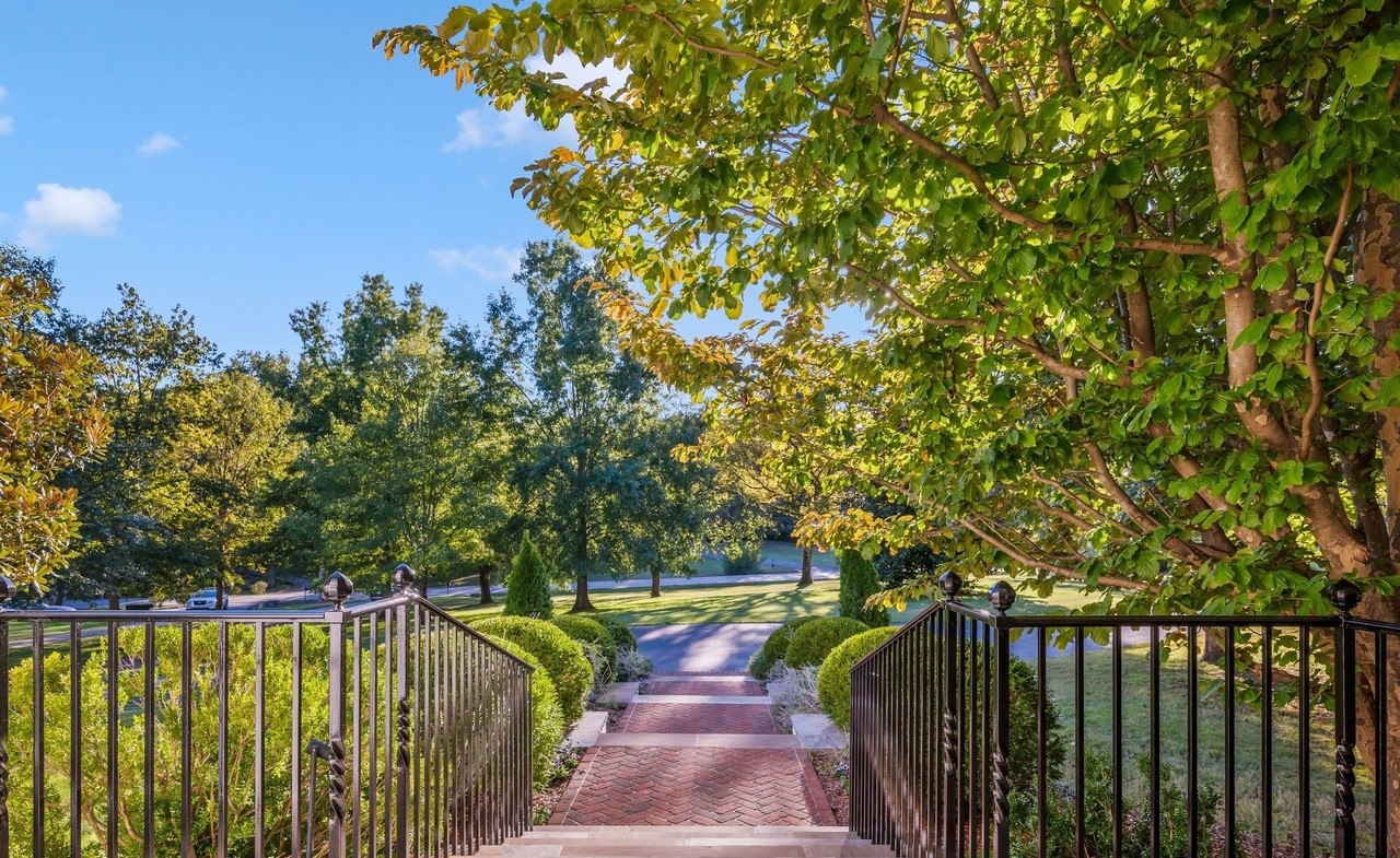 A stately formal garden pathway framed by mature trees and symmetrical black metal gates, leading toward a tranquil pond and manicured landscaping. The herringbone brick walkway and overhead pergola create an elegant, timeless outdoor space that exemplifies classical estate design with sophisticated landscaping and architectural detail.