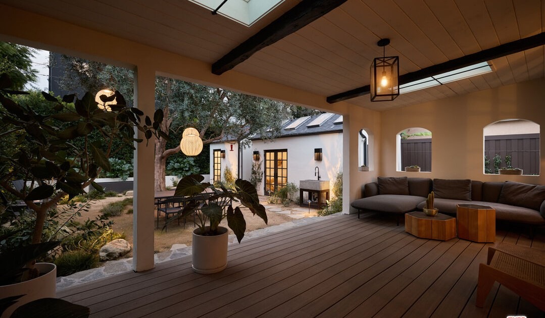 A sophisticated covered patio seamlessly blending indoor and outdoor living with warm stucco walls, exposed wood beam ceilings, and skylights that flood the space with natural light. The design features a striking juxtaposition of traditional architectural elements (arched doorways, fireplace) with contemporary furnishings and materials, creating an organic modern aesthetic that feels both warm and refined.