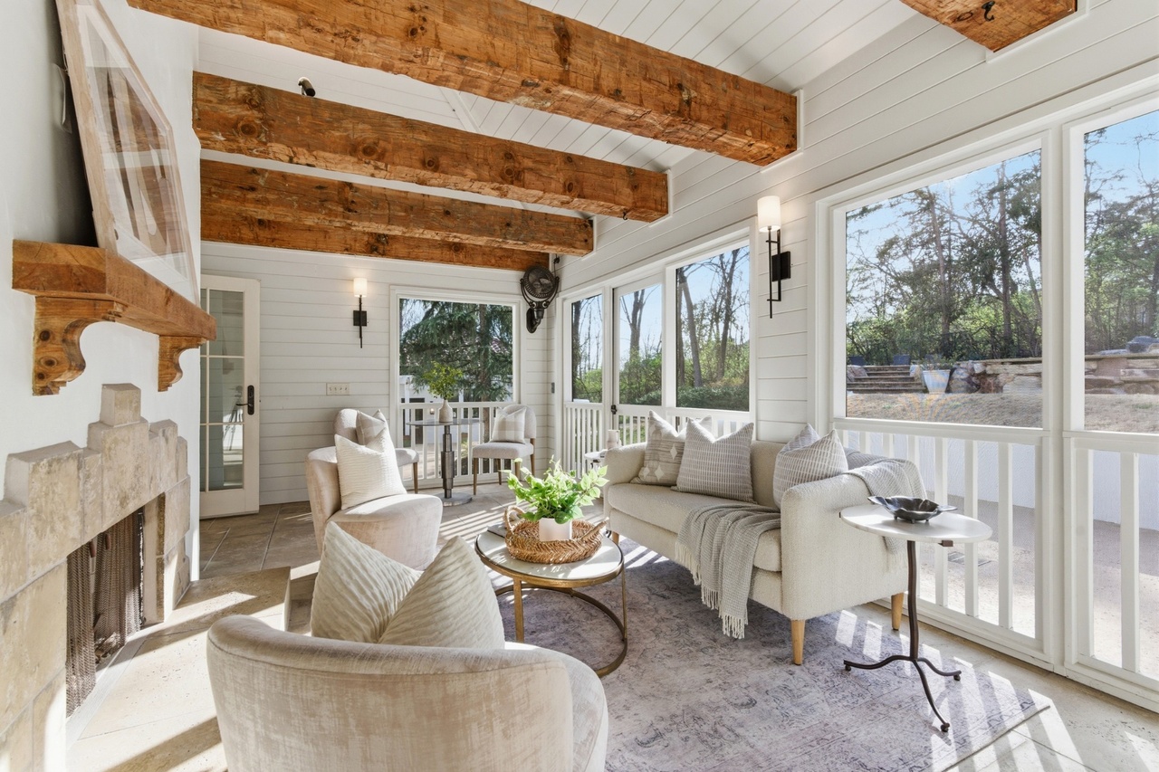 A sophisticated covered patio featuring soaring timber beams, crisp white shiplap walls, and a striking stone fireplace, anchored by curated furnishings in natural linens and warm neutrals. The space masterfully blends coastal elegance with organic modern sensibilities, creating an airy yet intimate outdoor living environment bathed in natural light.