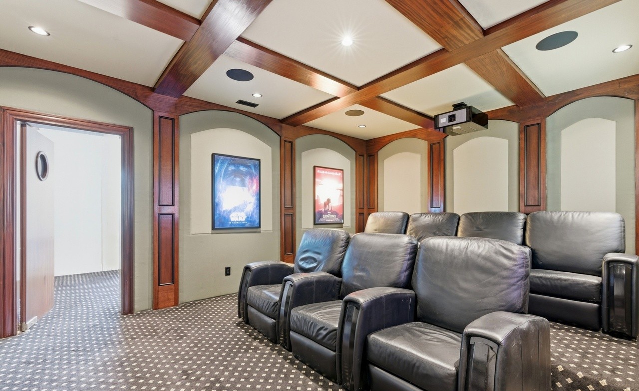 A sophisticated home theater featuring a coffered ceiling with exposed walnut beams, arched doorways with custom millwork, and a neutral cream and warm brown palette. The space elegantly combines traditional architectural details with contemporary media technology and premium leather seating for ultimate comfort and entertainment.