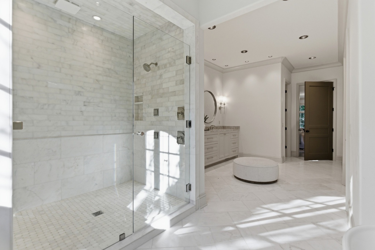 Walk In ShowerFrameless Glass EnclosureFreestanding Soaking TubFloating VanityDouble SinkRecessed LightingLarge Format Marble TileRain Shower HeadBody JetsHigh CeilingsAbundant Natural LightCustom Millwork