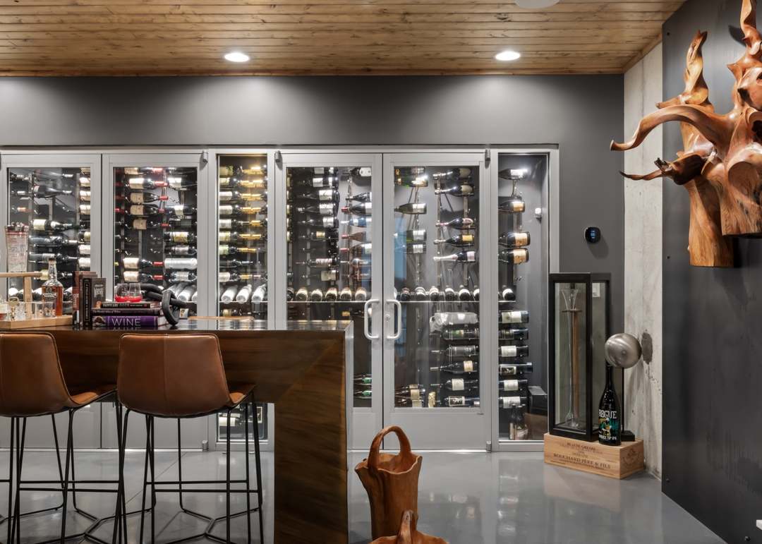A sophisticated wine cellar featuring extensive temperature-controlled glass-front wine storage with professional-grade display lighting and polished concrete flooring. The space combines organic modern design with warm wood ceiling details, leather bar seating, and a striking wooden sculptural art installation that adds artistic character to this luxury entertainment room.