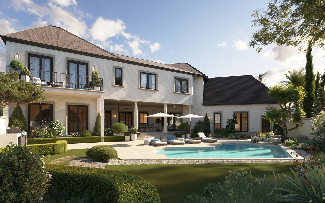 A stunning contemporary residential pool area featuring a pristine infinity-edge pool surrounded by manicured landscaping, white brick modern architecture with black metal accents, and a sophisticated lounge zone with white umbrellas and upholstered seating. The design exemplifies luxurious modern living with seamless indoor-outdoor integration, crisp neutral palette, and meticulous attention to detail.