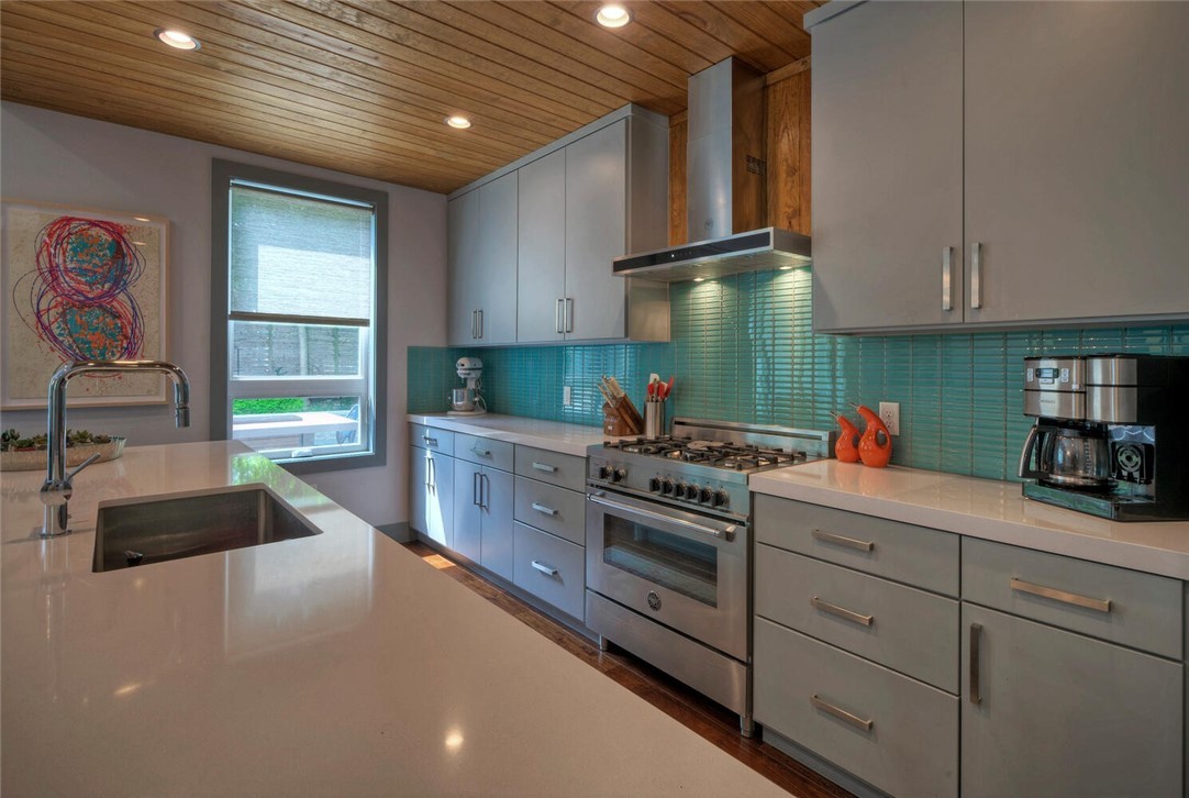 Range HoodUnder Cabinet LightingOpen ShelvingPeninsulaRecessed LightingLarge WindowStainless Steel Appliances
