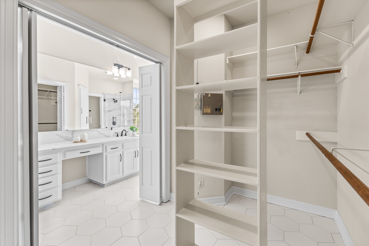 Double VanityFrameless Glass ShowerWalk In ClosetCustom MillworkBuilt In ShelvingHigh CeilingsCrown MoldingAbundant Natural Light