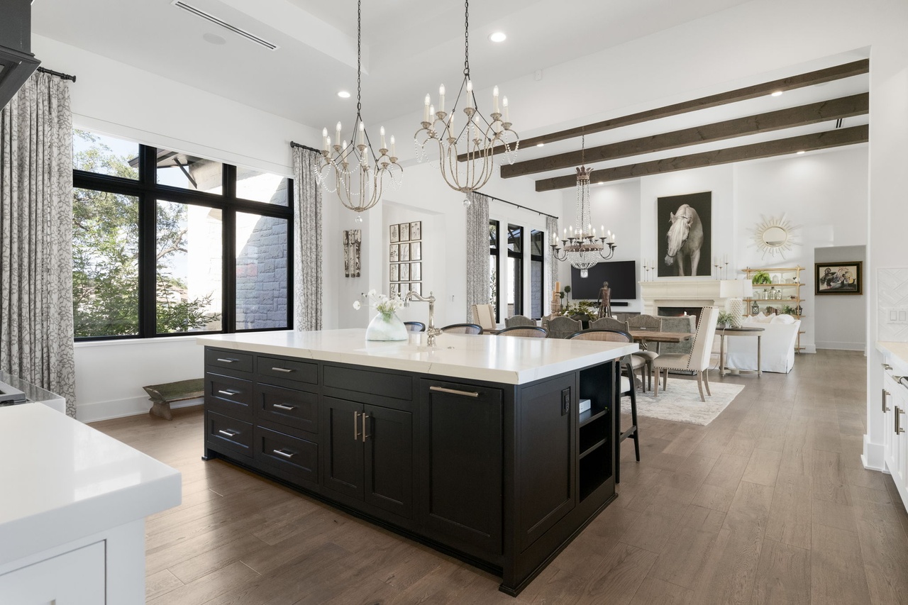 A sophisticated open-concept kitchen featuring a striking black island with white quartz waterfall countertop, anchored by two elegant brass chandeliers and refined transitional styling. Exposed wooden beams, soaring ceilings, abundant natural light from floor-to-ceiling windows, and seamless connection to the adjacent living area create an airy yet luxurious culinary and entertaining space.