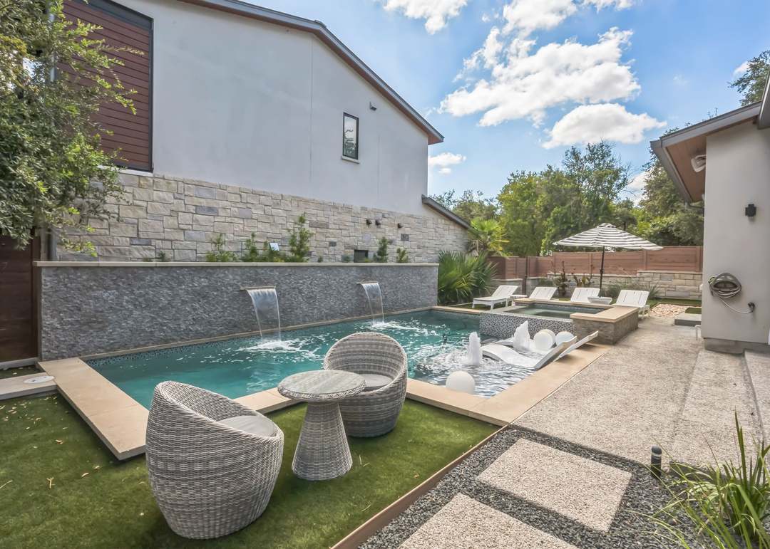 A stunning contemporary luxury pool area featuring a pristine turquoise infinity-edge pool with cascading waterfall features, sophisticated gray stone retaining walls, and premium woven lounge furniture arranged on a concrete patio. The space exemplifies resort-style elegance with manicured landscaping, professional hardscaping, and seamless indoor-outdoor integration backed by a modern two-story home.