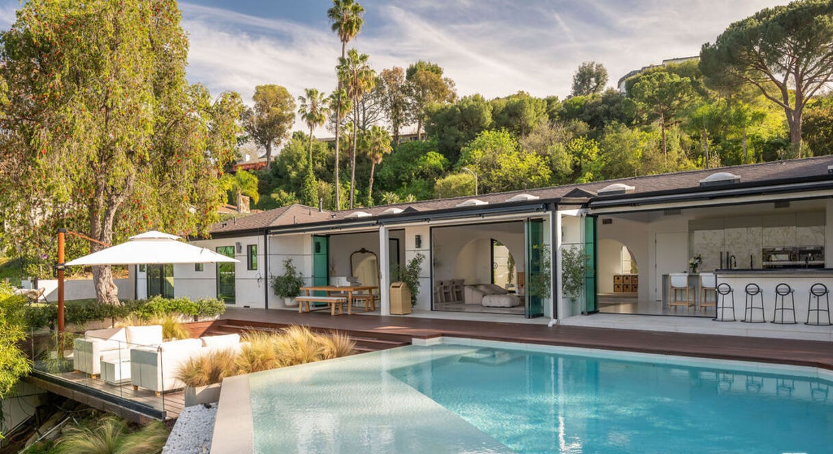 An exceptional resort-style pool area featuring a crystal-clear modern pool with a pristine composite deck, seamlessly integrated with a sophisticated white pavilion structure housing an open-concept bar and lounge zone. The design exemplifies organic modernism through its blend of clean architectural lines, abundant natural light via expansive glass doors, carefully curated furnishings, native plantings, and an uncluttered aesthetic that creates a serene, magazine-worthy outdoor living sanctuary.