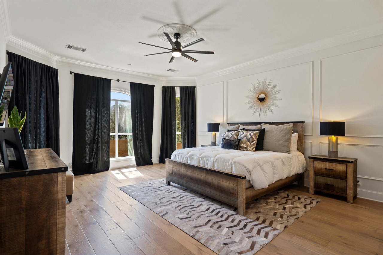 This sophisticated primary bedroom features a striking blend of transitional and organic modern design, combining traditional architectural elements like crown molding and wainscoting with clean-lined walnut furnishings and warm neutral tones. The abundant natural light from floor-to-ceiling windows is balanced by dramatic black curtains and layered textures, creating an exceptionally serene yet refined retreat.