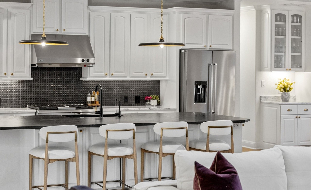 A stunning transitional kitchen featuring crisp white shaker cabinetry, dark mosaic tile backsplash, and a striking waterfall-edge quartz island anchoring the open-concept space. The sophisticated design balances traditional architectural details—crown molding and custom millwork—with contemporary materials and brass-accented statement pendant lighting, creating an elegant and inviting culinary hub.