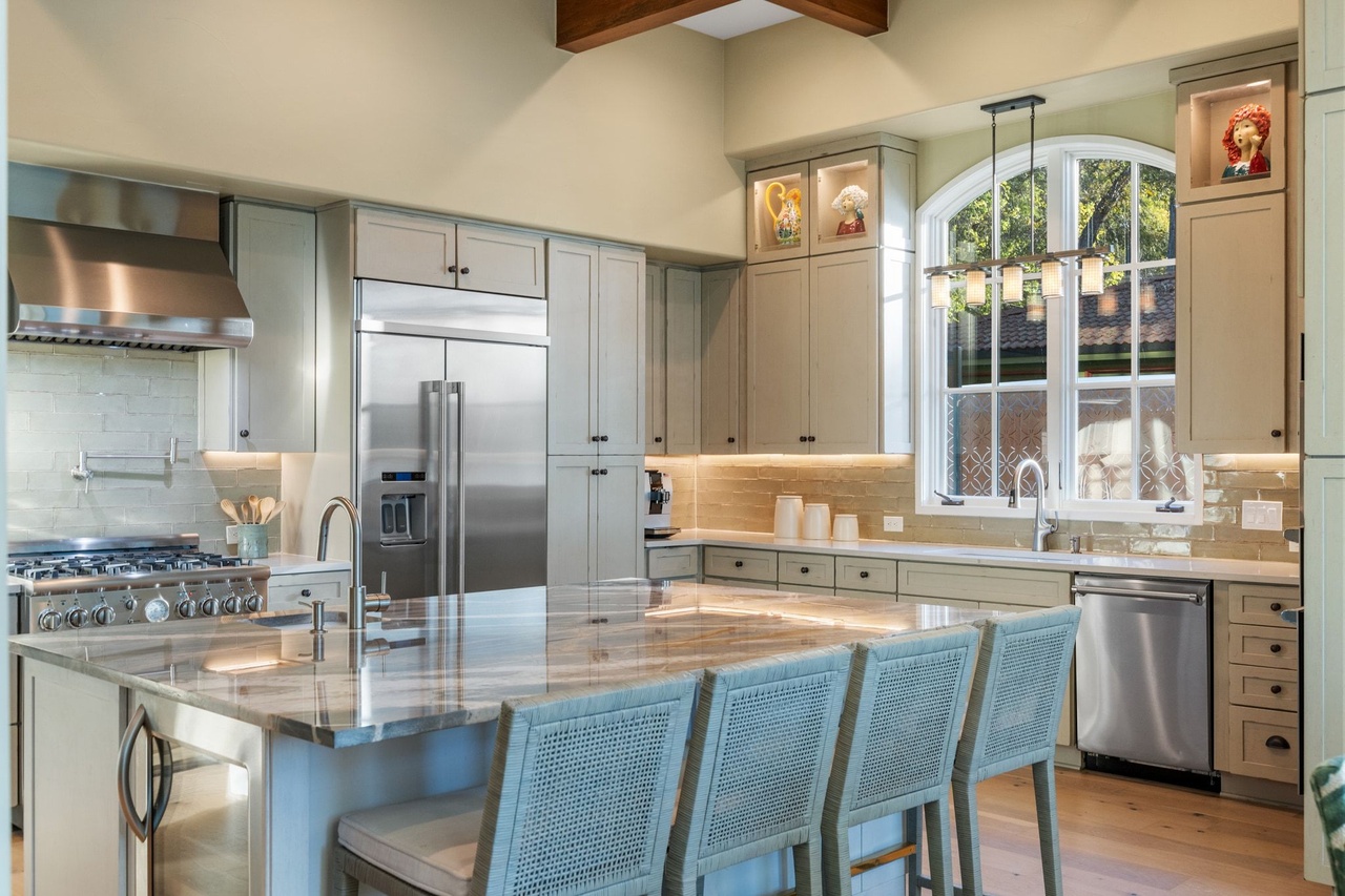 Waterfall IslandLarge Format WindowsPot FillerRange HoodOpen ShelvingIsland SeatingUnder Cabinet LightingHigh CeilingsCrown MoldingCustom MillworkStatement Lighting