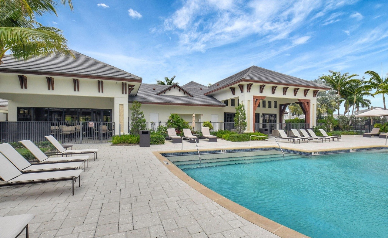 A stunning luxury resort-style pool area featuring a crystal-clear turquoise pool, multiple cream-colored pavilions with pitched roofs, and extensive stone paver decking with integrated lounge seating. The design seamlessly blends tropical elegance with contemporary architectural details, creating an aspirational outdoor entertainment space.