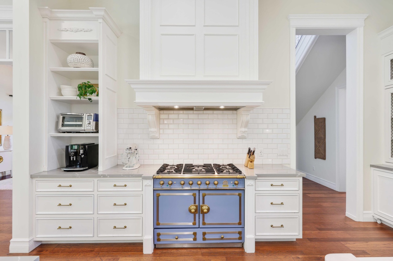 A sophisticated transitional kitchen featuring crisp white cabinetry with warm brass hardware, anchored by a striking periwinkle-blue professional-grade range with dual ovens and brass accents. The design balances classic architectural details (crown molding, built-in shelving, clean millwork) with contemporary conveniences (subway tile backsplash, recessed lighting, modern quartz countertops), creating an elevated yet inviting space with excellent natural materials and timeless elegance.