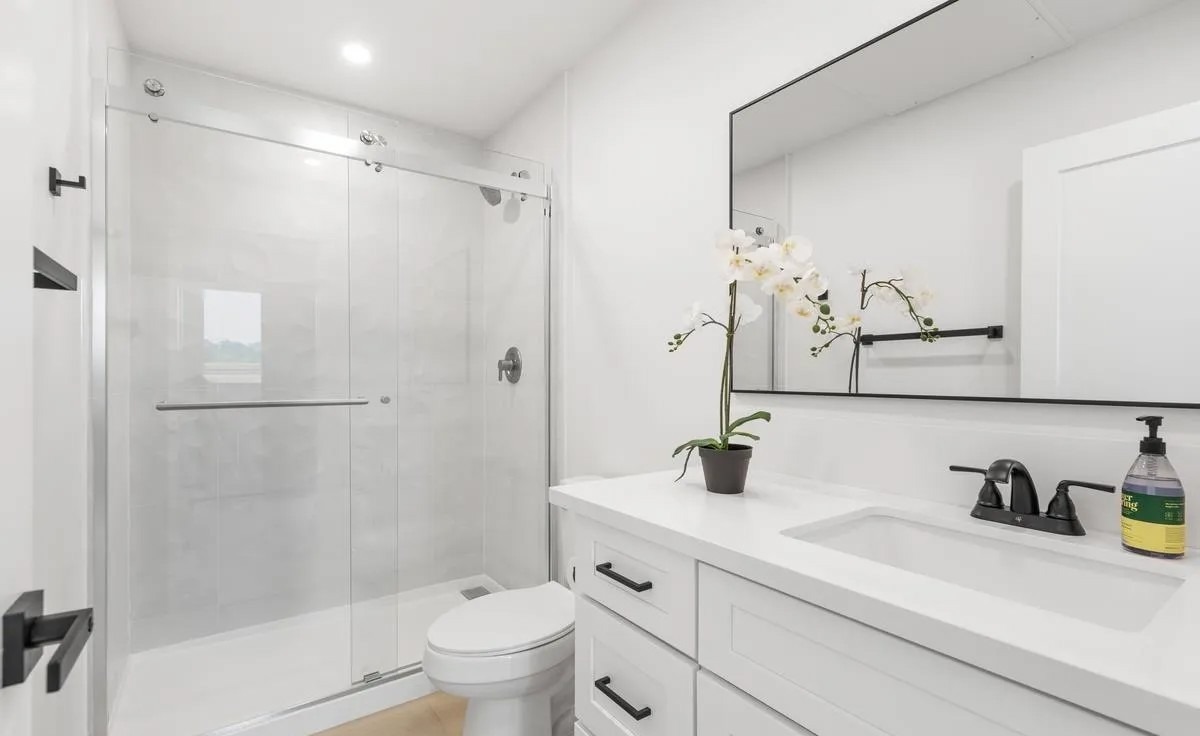 A sophisticated primary bathroom featuring a floating white vanity with quartz countertop, frameless glass walk-in shower, and clean-lined black hardware throughout. The serene, minimalist palette of white walls and large-format tile creates an airy, spa-like atmosphere complemented by a potted orchid and contemporary black accents.