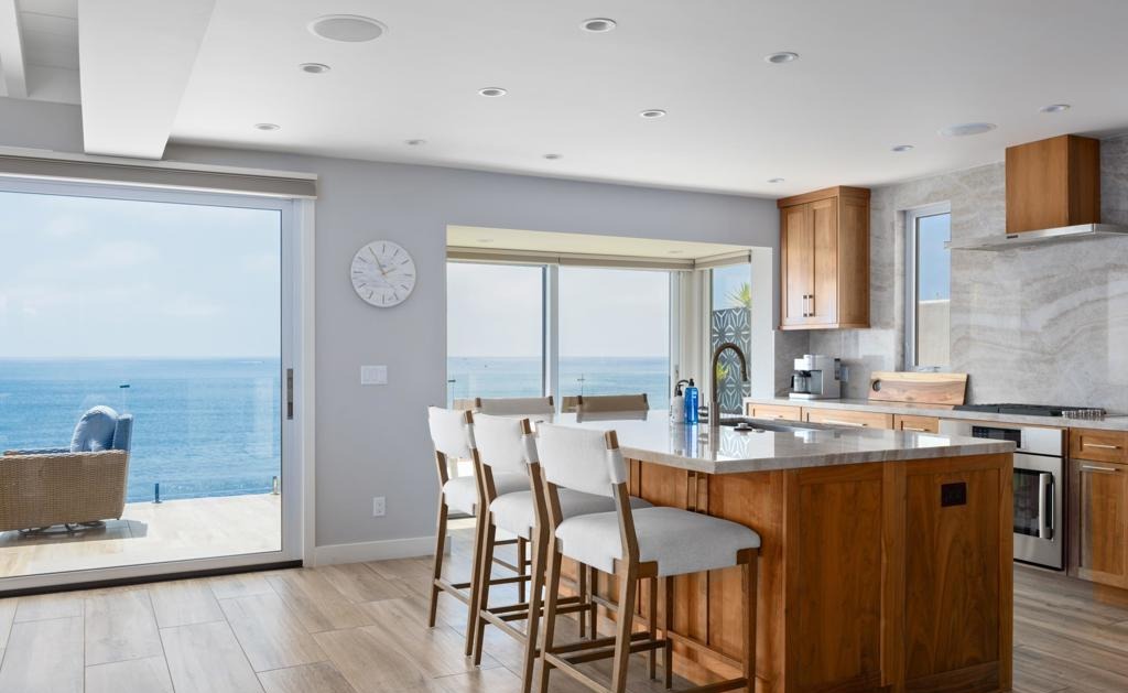 Waterfall IslandOpen ConceptFloor To Ceiling WindowsOcean ViewRecessed LightingRange HoodBar Seating