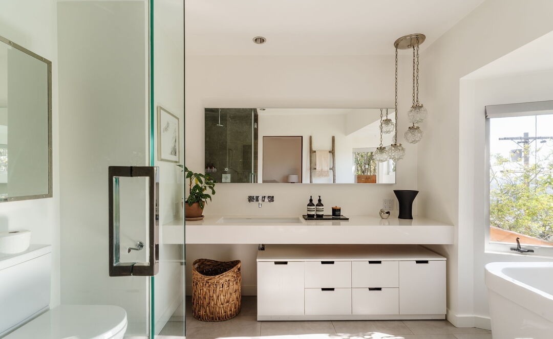 Double VanityFloating VanityFreestanding TubWalk In ShowerStatement LightingFrameless Glass ShowerNatural LightFloor To Ceiling Windows