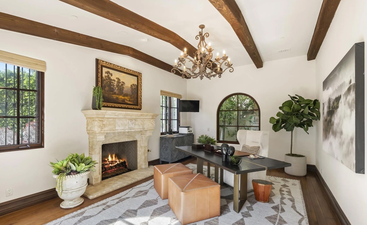 A sophisticated home office with soaring exposed timber beams, a marble fireplace, and abundant natural light from multiple arched and rectangular windows. The space exemplifies refined transitional design with warm architectural details, cognac leather furnishings, and carefully curated vintage and contemporary pieces arranged for both elegance and functionality.