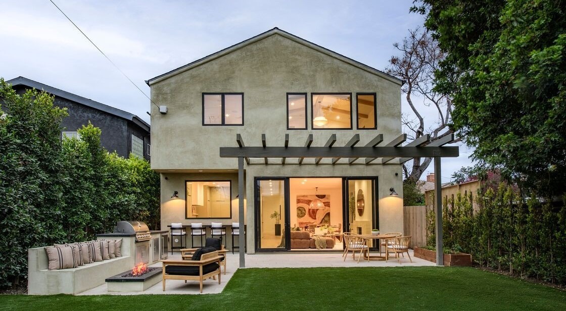 A stunning Southern California modern outdoor entertaining space featuring a seamless indoor-outdoor integration with polished concrete countertops, a dramatic black pergola, built-in fire pit seating, and direct access to the minimalist residence. The design balances contemporary architecture with warm natural materials and lush landscape screening, creating an editorial-quality resort-like retreat.