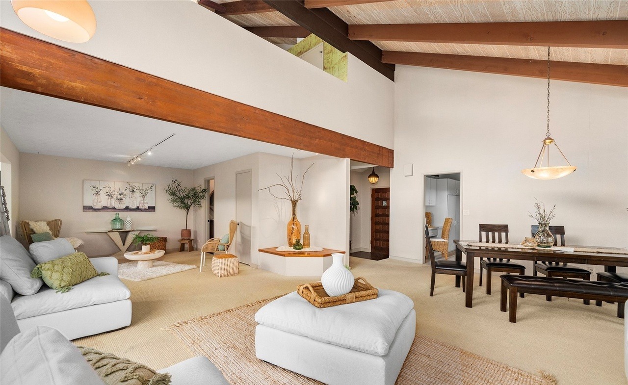 An expansive open-concept living and dining space anchored by dramatic exposed timber beams and abundant natural light, featuring a warm palette of whites, creams, and natural woods complemented by organic textures like rattan, woven accents, and fresh botanical elements. The thoughtful layering of mid-tone wood furniture, soft upholstery, and artisanal ceramics creates a refined yet livable luxury atmosphere that balances contemporary comfort with organic warmth.