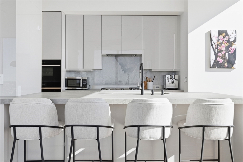 A strikingly minimalist kitchen featuring a dramatic marble waterfall island with soft gray tones, floating white cabinetry, and black matte hardware that creates a serene, gallery-like aesthetic. The space achieves luxurious sophistication through intentional restraint, with natural light streaming across polished concrete flooring and a sculptural slab backsplash that anchors the design.