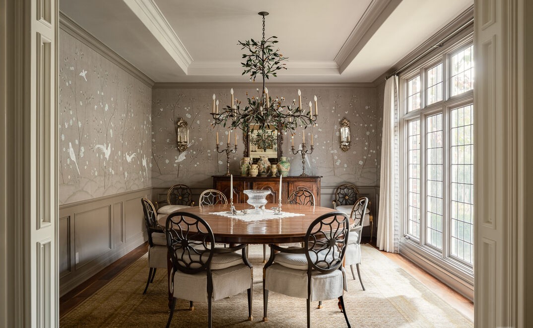 A formal dining room with elegant transitional design featuring hand-painted Chinoiserie wallpaper, coffered ceiling, and sophisticated brass-accented chandelier, creating a refined, collected aesthetic. Large casement windows flood the space with natural light while custom architectural details including wainscoting and crown molding establish timeless luxury.