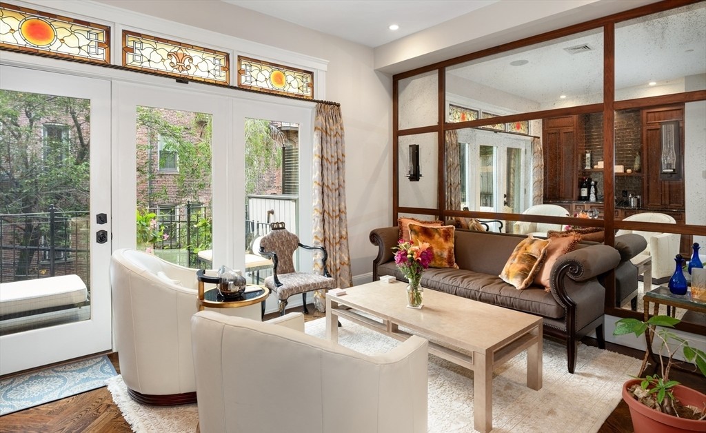 A sophisticated transitional living room featuring elegant custom woodwork, stained glass transoms, and a dramatic mirrored accent wall that amplifies natural light from oversized French doors. Rich warm tones—cream, brown, and gold accents—combine with premium furnishings and brass hardware to create a refined, gallery-like space that balances formal luxury with inviting comfort.